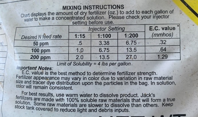 The results of the calculations match up with the instructions on the back of our fertilizer bag. By adding the values in the 1:100 column for 100 ppm (6.75) and the value for 200 ppm (13.5) together, you get very close to the same results: 20.25 ounces per 1 gallon of water.