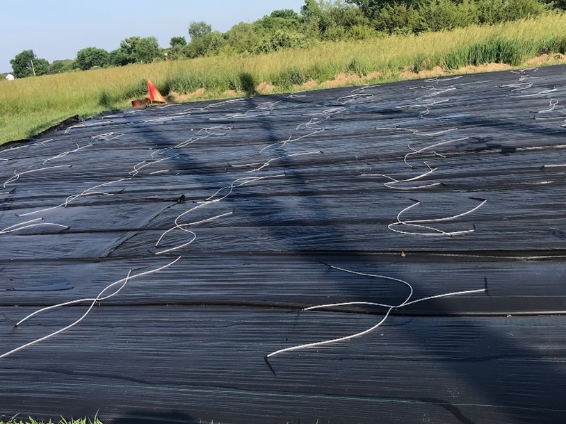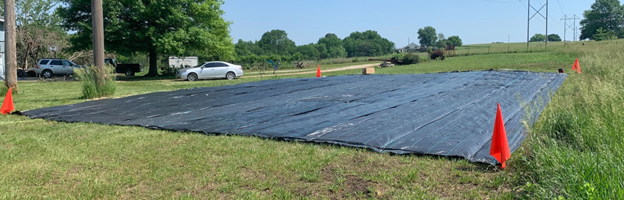 The weeds and grass need to be kept at bay. We tried various geotextile fabrics for the area. This ground cover fabric comes in various widths, lengths, thicknesses, and lifespans. Overlap the fabric by 6” or better.