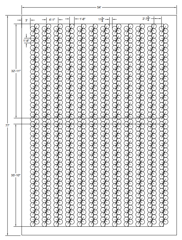 The network is laid out as shown below. There are two independent networks each supplying water and fertilizer to 500 plants. The overall size of the network is 77’ X 54’. Each plant is expected to have a crown of 1’-8”(20”). Each plant is spaced 1’-8” apart. The lateral lines are spaced 4’-1” apart. The space between the plants (walkway) at full maturity is 11 3/4”. There is a 3’ walkway all around the outside of the plants.