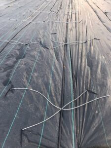 Use ground stakes to keep the fabric in place. Using wider rollers of fabric reduce the number of ground states required to keep the fabric in place. When the water lines are added, they will be held in place with the same stakes which will help keep the geotextile in place. A strong wind can lift the fabric if plants aren’t in place yet or during the winter break. I use old tires to help keep the fabric in place during the off season.