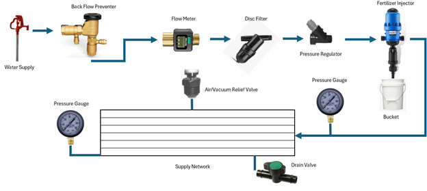 The water for the distribution system is supplied to the irrigation lines described above. There are several documents on the internet that discuss the design of an irrigation system. Some are well written, and some are extremely difficult to comprehend. Our website is intended to show you how we successfully put together a useable irrigation system for mums. The final element of the irrigation system is the pump and fertilizing equipment. The diagram below shows the general layout of the equipment used in fertilizing and irrigating.